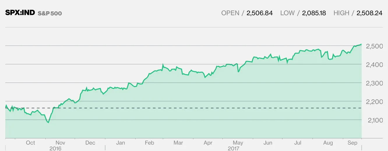 Pues ahora le pasaría lo mismo a un inversor que dentro de 30 años descubriéramos en una cueva. A pesar de todos los temores, de las preocupaciones por el dólar, de la retirada de estímulos, de Trump, de Corea... a pesar de todo ahí sigue erre que erre.