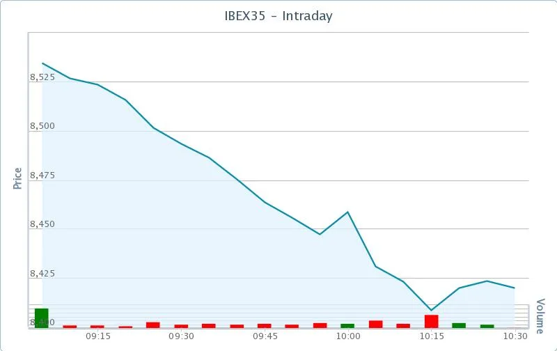 El recorte por fin ha llegado. Después de varias sesiones remoloneando, el Ibex está cayendo hoy fuerte: a esta hora cerca de un 1,75%, hasta 8.420 puntos.