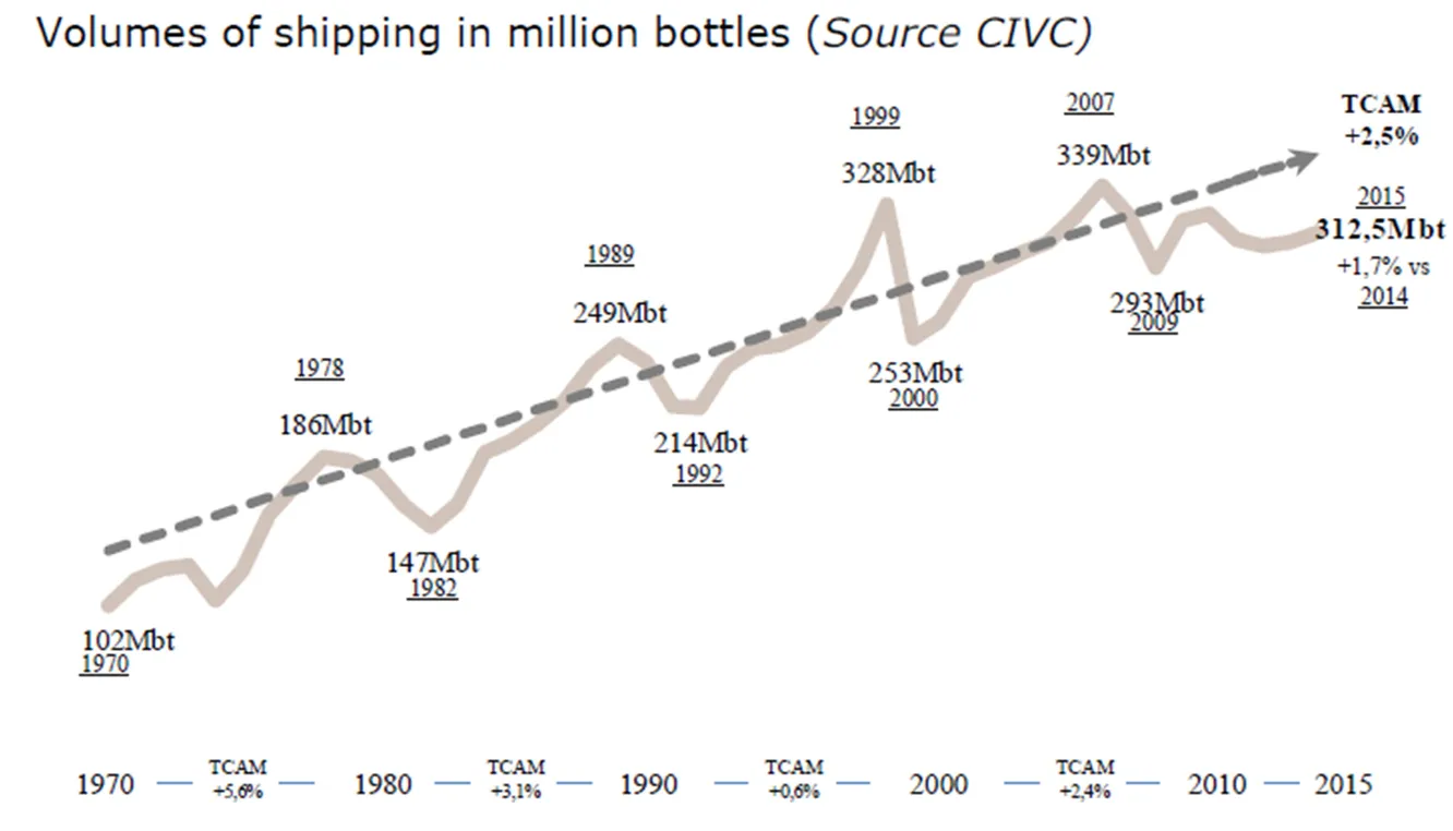 En el siguiente gráfico se muestra la evolución de la producción de botellas de champagne (en millones) en los últimos 40 años. Como podemos ver, las unidades de champagne vendidas han ido creciendo al 2,5% anual en los últimos 40 años. Las ventas de champagne se reducen con las crisis económicas, pero como vemos, después de cada ciclo económico, las botellas de champagne vendidas vuelven a los niveles de crecimiento de largo plazo.