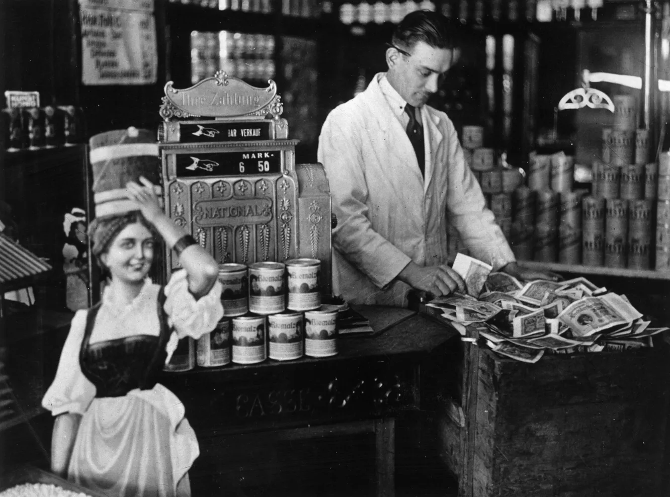 La primera fotografía es de un comercio de la república de Weimar, supongo que por el año 1923. La segunda, ni idea, está extraída del artículo que amablemente ha enlazado @arturop: http://www.cronicasdeunmundofeliz.com/2016/07/mesa-de-negociacion.html