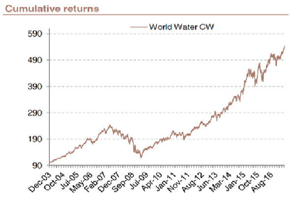 Entre las posibilidades de Inversión Socialmente Responsable, se encuentra la inversión Temática y dentro de la Inversión temática una opción es invertir en empresas relacionadas con el agua y su uso eficiente y sostenible. Por ejemplo, el ETF LYXOR WORLD WATER UCITS ETF es un fondo cotizado (ETF) que cumple con la normativa UCITS, cuyo objetivo consiste en replicar el índice de referencia World Water CW Net Total Return (www.sgindex.com). El SGI World Water CW (Ticker de Bloomber: WOWACX) es un índice ponderado en función de la capitalización bursátil hasta un máximo del 10% (es decir, la ponderación de una acción incluida en el índice no podrá ser superior al 10%) compuesto por las 20 mayores compañías que operan en los campos del abastecimiento de agua, de las infraestructuras de abastecimiento de agua y del tratamiento del agua. El índice es calculado por Dow Jones y recopilado por Sustainable Asset Management, reajustado cada trimestre y revisado cada seis meses.