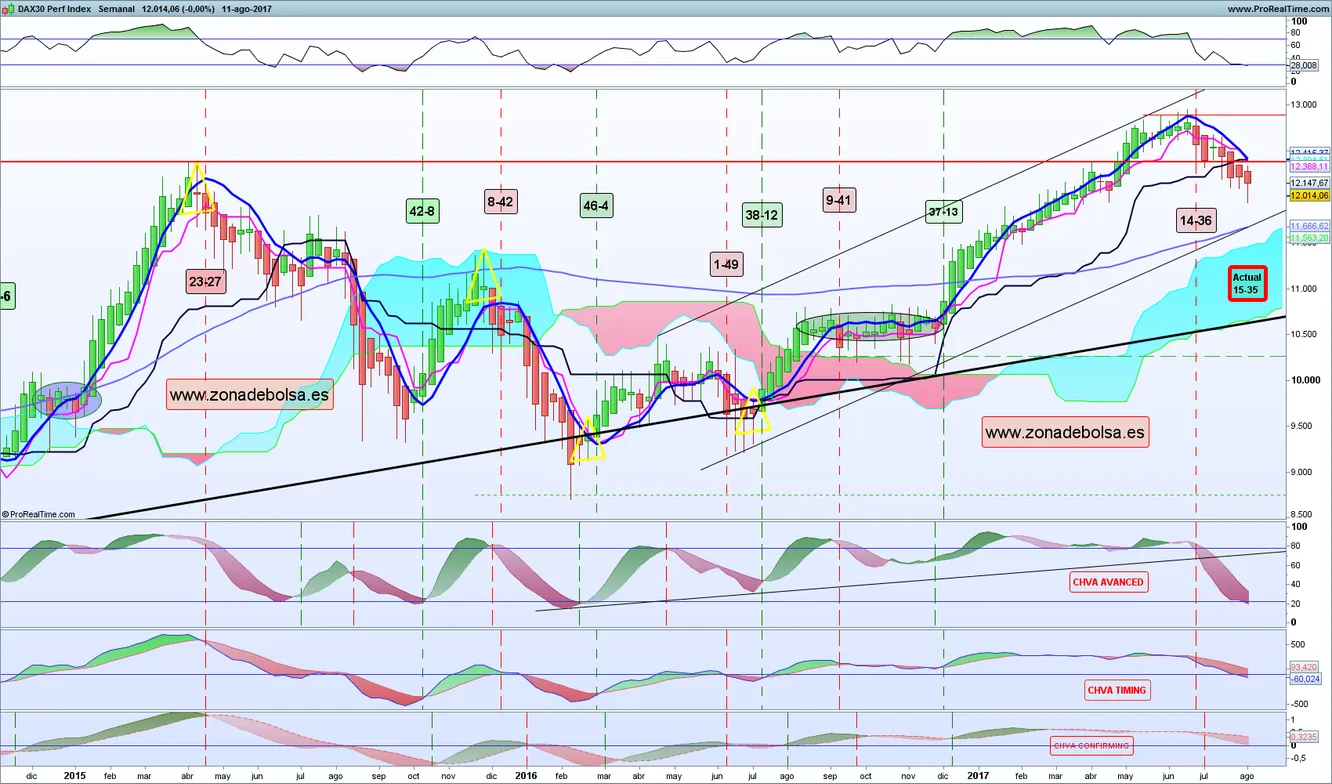 Va para 2 meses que el DAX 30 alcanzó un máximo de 12.951 puntos, lo que le dejó a las puertas del 13.000 en números redondos, y desde entonces no ha dejado de caer, hoy viernes ha cerrado a 12.014, después de hacer un mínimo de 11.934, prácticamente 1.000 puntos por debajo del máximo, casi un 8% de corrección.