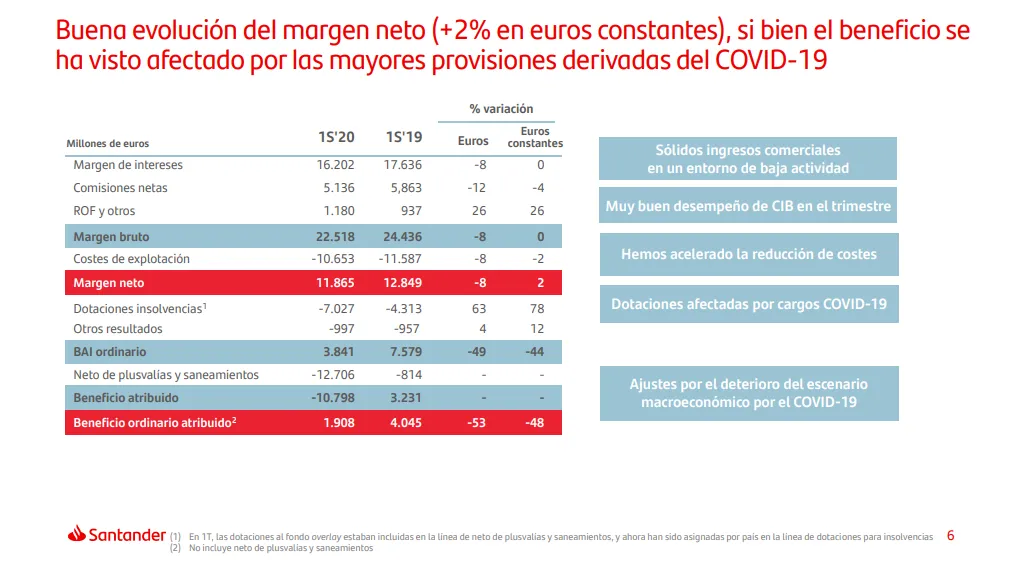 Pero aunque nos encontremos muy cómodos viendo pasar el verano desde la tranquilidad, eso no quiere decir que perdamos el interés por los acontecimientos que se suceden y en esta ocasión creo que tenemos que comentar la presentación de resultados del 1S-20 del mayor banco español, nada menos que el Banco de Santander, con una pérdidas de -10.798 millones de euros.