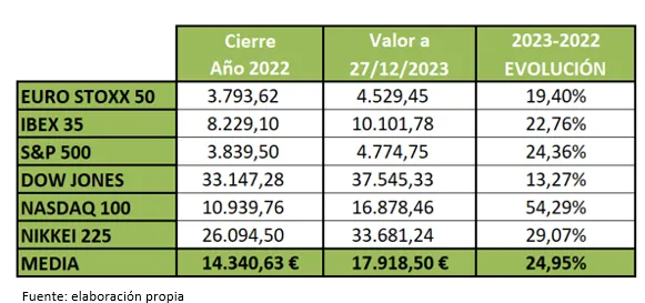 Los principales índices bursátiles han tenido un comportamiento mejor de lo esperado con una subida media del 24,95% en un solo año, recuperando en solo un año la pérdida que tuvieron en el año 2022 que fue cercana al 14%.
