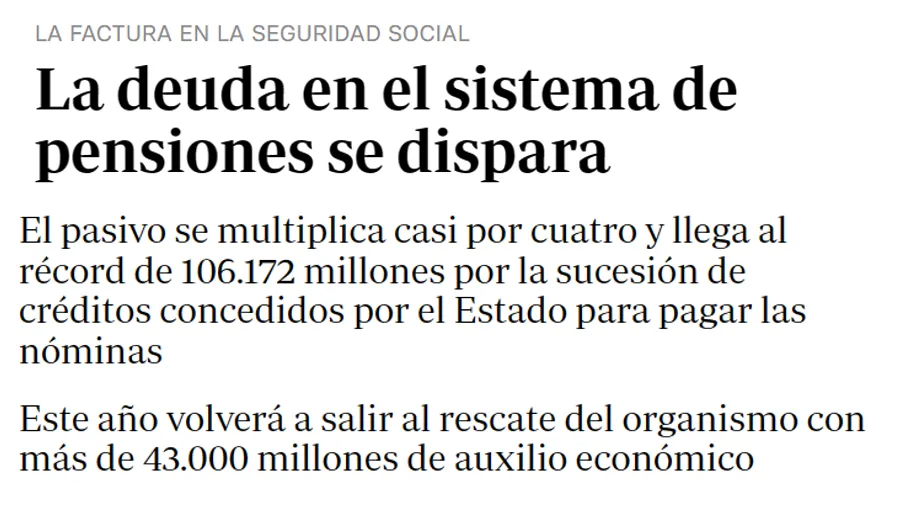 Según noticia publicada en ABC el 24/01/2024, la SS le debe al Estado 106 mil millones de euros, porque no recauda dinero suficiente cada mes para pagar las pensiones y este año se volverá a endeudar en otros 43 mil millones más para que le cuadren las cuentas.