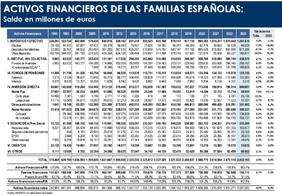 En el mundo financiero, el efectivo en cuentas corrientes y los depósitos bancarios a plazo, han sido y siguen siendo los instrumentos favoritos elegidos por españoles para guardar su ahorro, ya que actualmente según Inverco (Asociación de Instituciones de Inversión Colectiva y Fondos de Pensiones) los españoles a 31 de diciembre de 2023 teníamos ahorrados en depósitos y efectivo más de 1 billón de euros, es decir más de un millón de millones de euros que representan casi el 40% del dinero que tenemos ahorrado las familias españolas.