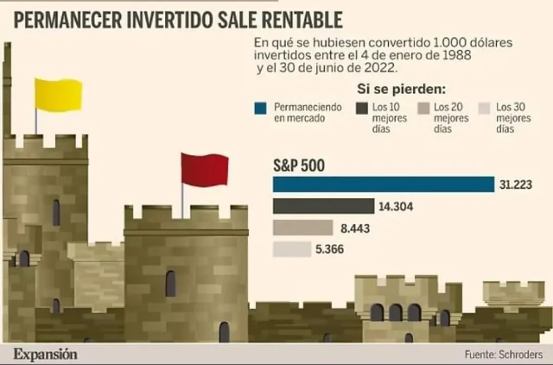 Quinto, no pierdas el rumbo si quieres llegar a buen puerto, el objetivo es lograr lo que te hayas planteado y si pierdes el rumbo en vez de permanecer en los mercados, acabarás saliendo de los mercados en los momentos difíciles y te perderás los momentos de subidas, que como puedes ver en esta imagen publicada por el diario Expansión (Fuente Schroders) perderte los días de subidas hace más daño a tus resultados que el bien que en principio crees que consigues al salirte en los momentos delicados.