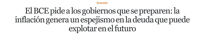 Si al final consiguen controlar la inflación, pasarán dos cosas, una es que el PIB bajará a sus niveles normales de inflación y la otra es que la deuda aumentará al pagarla más cara el Estado y por las medidas usuales de incremento de gasto público que se toman cuando una economía reduce su PIB, por lo que el ratio PIB/DEUDA puede dispararse en los próximos años y provocar una explosión de la deuda en el futuro. Y no lo digo yo, lo advierte el Banco Central Europeo como puedes ver en esta noticia publicada en elEconomista.es