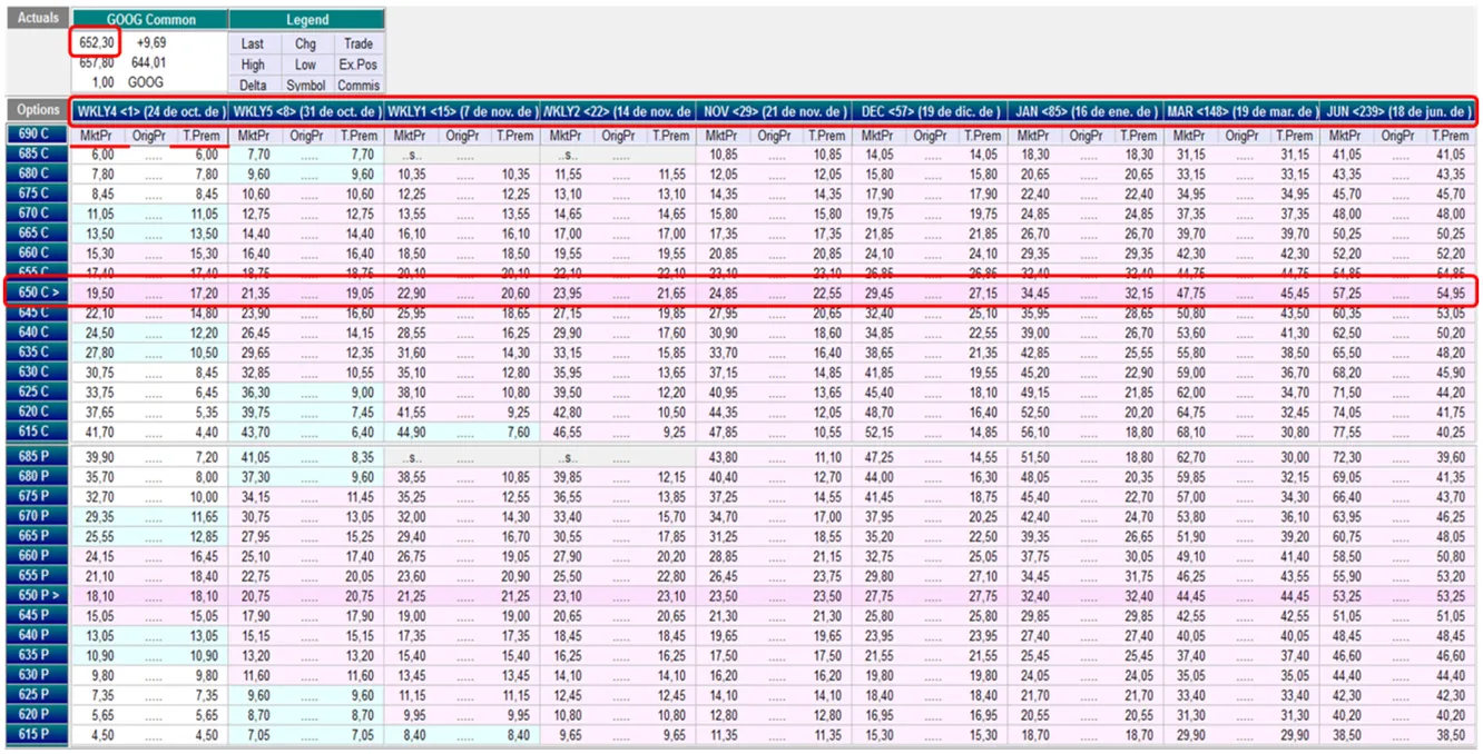 Abajo vemos un ejemplo real con el software de Optionvue . Google cotiza a 652,30 y vemos todas las cadenas de opciones desde el 24/10/15 al 18/6/2016. Y cada fecha marca la cantidad de días que faltan hasta el vencimiento. Tenemos las calls en la parte superior de la tabla y las puts más abajo. Hemos destacado el precio y valor extrínseco (valor temporal) de las calls strike $650 y vemos que: