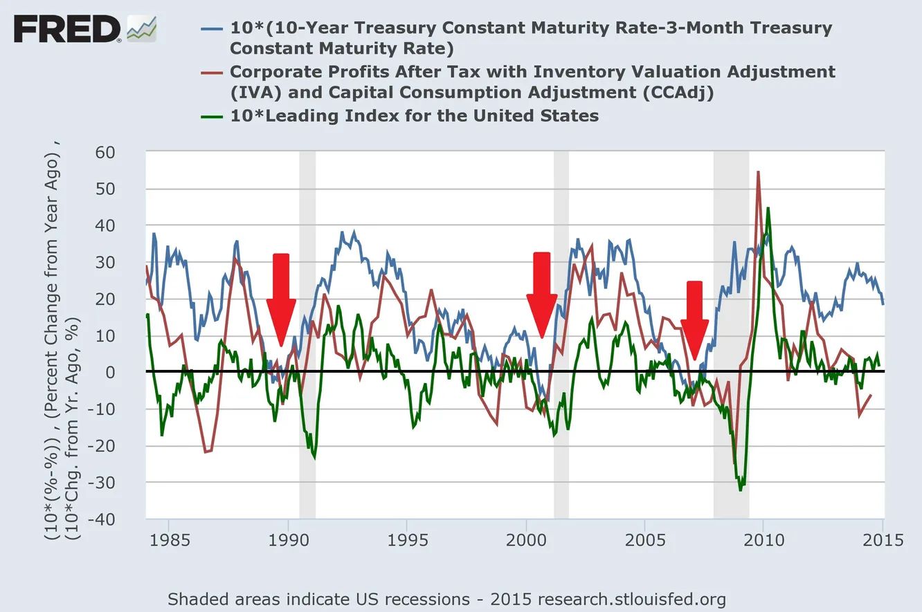 El Leading Economic Index (LEI) es un índice compuesto por un conjunto de variables (housing permits, unemployment insurance claims, ISM manufacturing survey… etc). Entre ellas se encuentra incluida el diferencial de tipos a largo y corto plazo (bono del tesoro a 10 años menos letras del tesoro a 3 meses), pero personalmente ‘necesito ver’ esta variable en terreno negativo y de ahí que la incluya como una de mis tres variables. Una curva de tipos invertida indica que “la fiesta del carry trade” (esto es, invertir a largo plazo pidiendo prestado a corto) se está acabando. La restante como ya he indicado es la tasa de cambio anual de los beneficios corporativos. Cuando estas tres variables se van a terreno negativo… “malos tiempos para la lírica” que decía la canción. Es probable que vengan meses de turbulencias.(En el gráfico, las zonas sombreadas corresponden a recesiones medidas según definición del NBER).