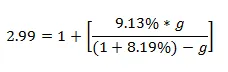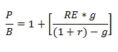 Los beneficios residuales (RE) consisten en la parte de beneficios que excede el coste de los fondos propios (r). Para determinar dicho coste, se ha utilizado la inflación esperada a cinco años (1,69%) más 650 puntos básicos – la llamada constante de Siegel (1,69% + 6,5%). Con una ratio P/E forward a 12 meses en las 17,4 veces, los analistas esperan unos beneficios de $135 para el siguiente ejercicio y una RoE del 17.32% ($135/779.61). Si se extrae el coste de los fondos propios (8.19%) se obtienen unos beneficios residuales sobre fondos propios del 9.13%. Con estos datos la ecuación anterior quedaría de la siguiente manera: