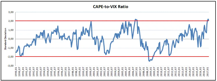 Si el lector de estas líneas esperaba una breve recensión sobre una de las obras maestras de Charles Dickens, reciba mis disculpas por anticipado. En su lugar, grandes esperanzas son las que - desde lo que va de año 2017, y a la luz de los datos - parecen albergar los inversores del S&P 500. Los “animal spirits” avivados por la victoria de Donald Trump han impulsado a la relación PER/VIX por encima de las dos desviaciones típicas, un lectura que históricamente ha indicado niveles de extrema complacencia y que desde 1990 sólo había sido observada durante el apogeo de la burbuja puntocom (2000) y en los momentos previos a la caída de Lehman Brothers (2007).