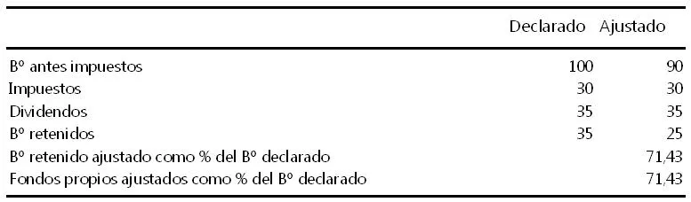 Históricamente los beneficios han sido sobreestimados entre un diez y un veinte por ciento. La explicación proviene del cuadro superior. Imaginemos que la empresa declara un beneficio de 100 unidades monetarias con una tasa impositiva del 30% y un payout o tasa de desembolso de dividendos del 35%. Entonces, la empresa desembolsará 30 unidades monetarias en concepto de impuestos y 35 unidades monetarias en concepto de dividendos. Si nos fijamos en la columna “ajustado” veremos que estas figuras coinciden. Es evidente que tanto los desembolsos por impuestos como por dividendos no son, en principio, manipulables, pues representan salidas reales de efectivo. La diferencia reside pues en el remanente, es decir, el residuo que queda al descontar de la cifra de beneficio antes de impuestos las partidas de impuestos y dividendos. En el ejemplo del cuadro, una sobreestimación de los beneficios del diez por ciento conduce a una sobrevaloración de los fondos propios cercana al 30%.