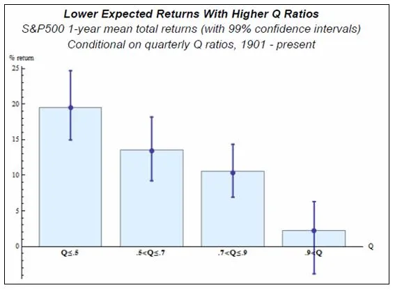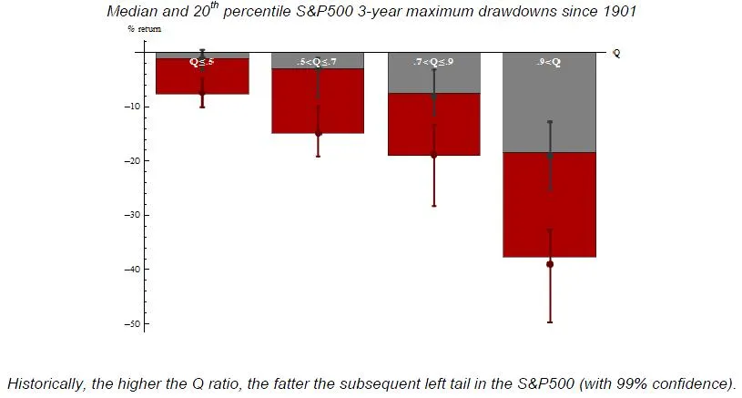 Del gráfico superior se desprende la relación inversa existente entre el nivel de ‘ ratio q’ y las posteriores rentabilidades obtenidas al año siguiente (datos desde 1901 hasta 2011). Las mayores rentabilidades se obtuvieron cuando las ‘ ratio q’ de entrada en el mercado fueron menores. El gráfico inferior muestra el valor central y quintil de pérdidas máximas obtenidas para cada nivel de ‘ ratio q’. Del gráfico se concluye que las pérdidas potenciales para los siguientes tres años incrementan conforme mayor sea esta ratio.