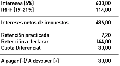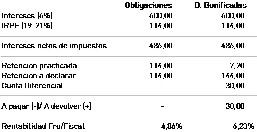 En la declaración del IRPF, el inversor deberá tributar como Rendimiento del Capital Mobiliario por el importe recibido (600 euros) al tipo del 19-21% (19%*600=114 euros). La especialidad de las obligaciones bonificadas consiste en que de esta cantidad, se podrá deducir, en concepto de retención practicada, el 24% de los intereses abonados (24%*600=144), ello con independencia de que la retención efectivamente practicada haya sido de 7,2 euros (1,2%*600). Por tanto al inversor Hacienda le devolverá 30 euros.