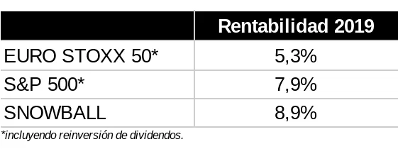 La rentabilidad neta de gastos de Snowball acumulada en 2019 es del +8,9%. Asimismo, les recordamos que rentabilidades pasadas no son garantía de rentabilidades futuras.