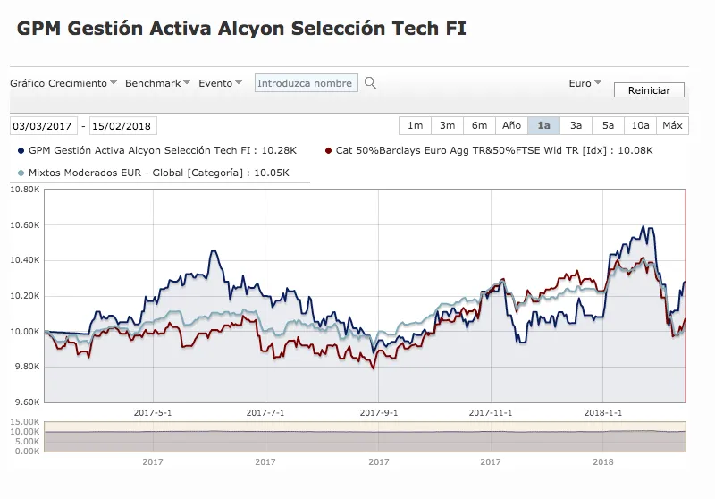 En unas semanas el fondo GPM Alcyon Seleccion Tech que gestiono cumplirá su primer año de vida y Track Record. Este año 2018, primer año en que tendremos track record anual completo hemos comenzado con buen pie y actualmente el fondo gana un 2,25% en el año y se encuentra en la segunda posición de la categoría de fondos mixtos moderados globales en euros según el ranking que prepara Morningstar. A pesar de que los primeros meses de la gestión de un fondo siempre son complicados debido a la cantidad de gastos fijos de constitución que hay soportar y de que el capital bajo gestión inicial con el que empezamos fue bajo, desde su inicio estamos batiendo a nuestro índice y categoría de referencia en más de un 2%. Ver gráfico.