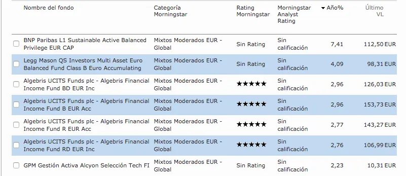 Esta es la clasificación de los primeros fondos del año de la categoría Fondos Mixtos moderos globales en Euros según Morningstar: (Nota: Los dos primeros de la lista son fondos cuya actualización se remonta a 2015 y están erróneamente en la clasificación anual del 2018, me he puesto en contacto con Morningstar y dicen que se debe a que no borran fondos de su base de datos aunque hayan dejado ya de cotizar). Los primeros que aparecen realmente son las diferentes clases del fondo de Algebris UCITS Funds y en segunda posición en fondo GPM Alcyon Seleccion Tech. La categoría la componen unos 400 fondos.