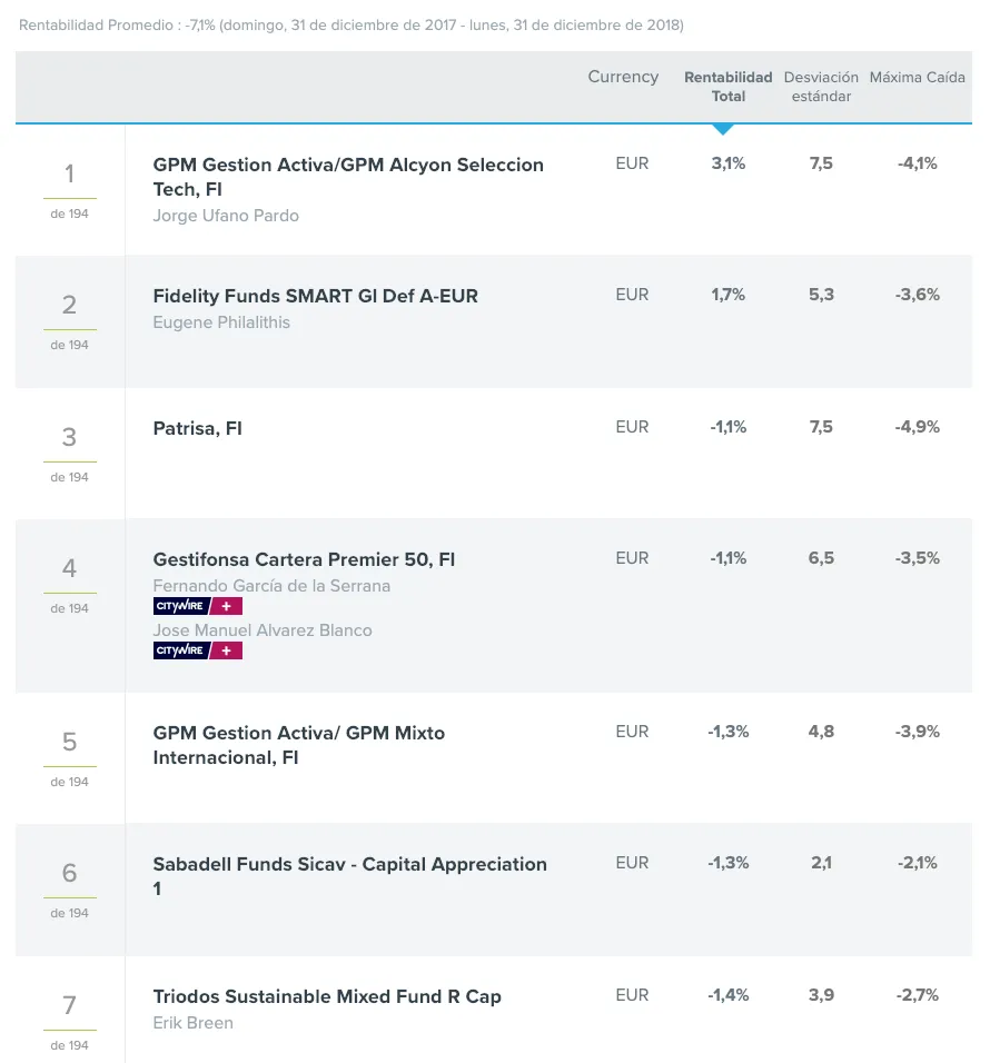 Esta tarde se han publicado los rankings del año 2018 de todas las categorías que selecciona la rankeadora de fondos Citywire. Los actualiza a mitad del mes siguiente para hacer una comparativa de todos los fondos a misma fecha de valor liquidativo 31 de diciembre de 2018 en este caso.