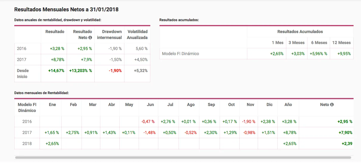Aprovecho el artículo para dejaros también el cuadro de rentabilidades mensuales del modelo de gestión de carteras FI Dinámico que opera a través de una selección de fondos de inversión que también gestiono en GPM: Con exposición máxima permitida a la renta variable del 75% de la exposición total, misma condición que tiene el fondo GPM Alcyon Selección Tech.