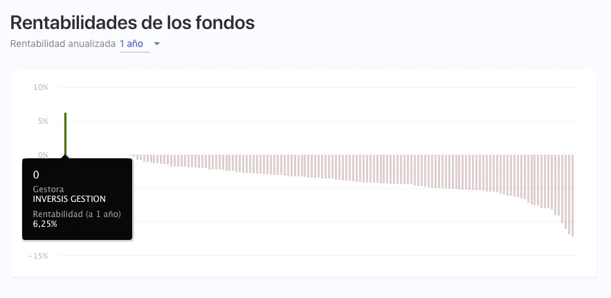 Fondos de la categoría mixtos moderados globales en euros en el último año según Finect, en verde en positivos que lidera el Alcyon con un 6,25% de rentabilidad, en rojo los fondos con rentabilidades negativas.