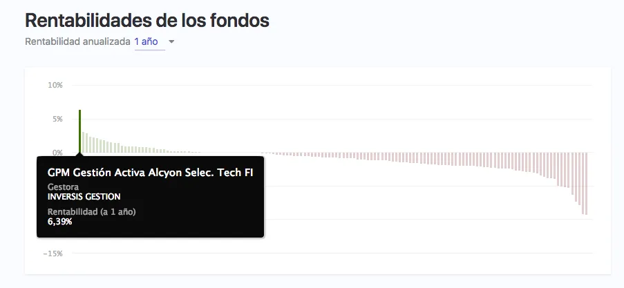 Este gráfico de Finect es una buena radiografía del estado actual de la categoría de todos los fondos mixtos moderados globales en euros a un año (fondos con ganancias en verde o pérdidas en rojo) en donde se encuentra en primer lugar el fondo GPM Alcyon que gestiono.