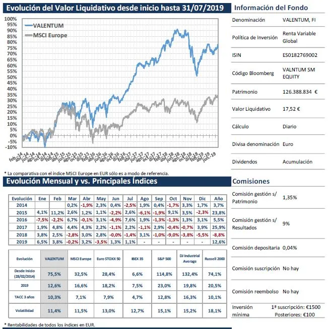 Durante el mes de julio, VALENTUM subió +1,06% (Eurostoxx -0,09%, IBEX -2,08%, MSCI Europe