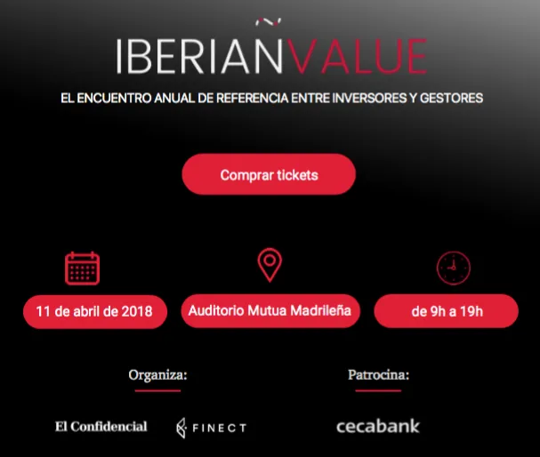 Ya faltan apenas dos semanas para la gran fiesta de la inversión en España. El próximo 11 de abril, en el auditorio de Mutua Madrileña en Madrid, ante más de 200 asistentes, 21 de los mejores gestores españoles nos contará el caso de inversión de una de sus compañías en cartera en Iberian Value, el evento que organizamos El Confidencial y Finect, con el patrocinio de Cecabank.