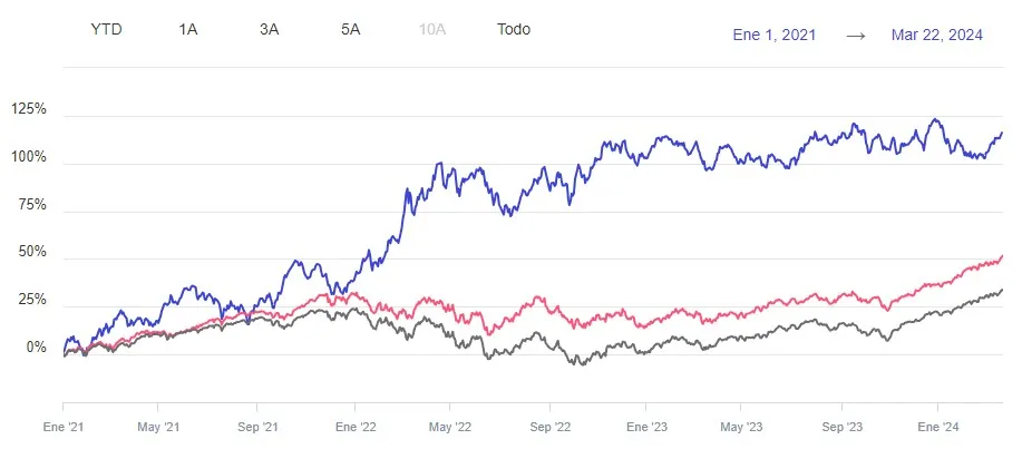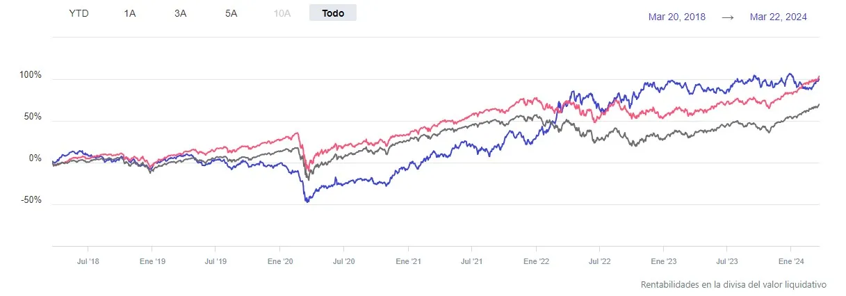 Como puedes imaginar los diferentes ratios comparativos cambian mucho en función de las fechas que usemos. No es lo mismo analizar productos tan diferentes a 1 año, 3 o 5 al tener comportamientos tan dispares. Por ello vamos a empezar con los datos a mayor plazo: