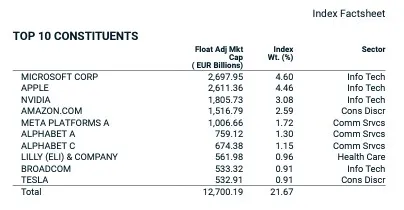 En esencia, el fondo compra las empresas más grandes de los países desarrollados en función de su capitalización bursátil (tamaño) sin aplicar ningún criterio de valoración a ellas. Por tanto, a más grandes son las empresas mayor peso tiene en la cartera del fondo. Esto los ha llevado a tener un peso muy elevado en las empresas de EEUU que ya pesan más del 70% de la cartera, y específicamente en las mayores y las conocidas como las 7 Magníficas que cada vez tienen mayor peso en cartera, sobre el 20%, como puedes ver en la siguiente imagen: