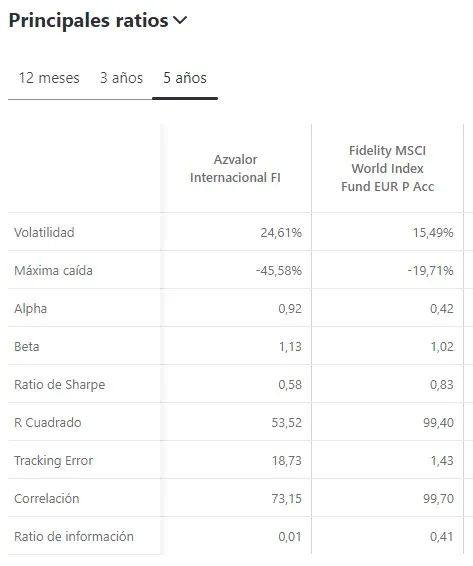 Lo primero que destaca son las métricas de riesgo, con un comportamiento mucho peor de Azvalor. Muestra una elevada volatilidad de 24,6% muy superior al 15,5% de Fidelity MSCI World. Pero lo peor viene en la máxima caída donde vemos un -45% en la gestora Value contra un -20% de Fidelity. Sin duda una diferencia sustancial y que muestra que ha sido un periodo muy complicado para Azvalor con una caída muy elevada.