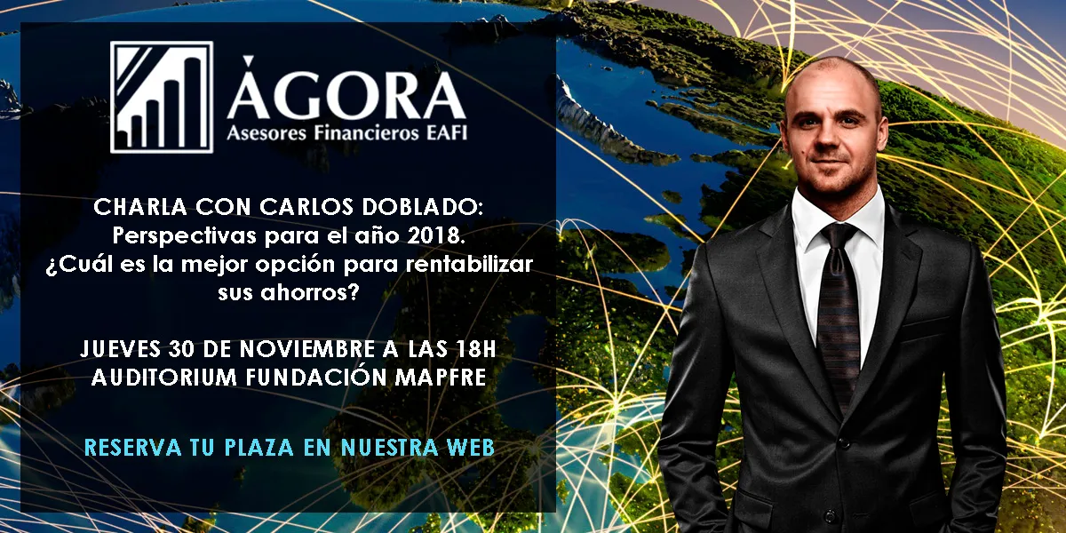 El próximo jueves 30 de noviembre, desde las 18:00 horas, Ágora EAFI celebra una conferencia titulada "Perspectivas para el año 2018. ¿Cuál es la mejor opción para rentabilizar sus ahorros?". El evento tendrá lugar en el Auditórium de la Fundación Mapfre en Paseo de Recoletos, 23.
