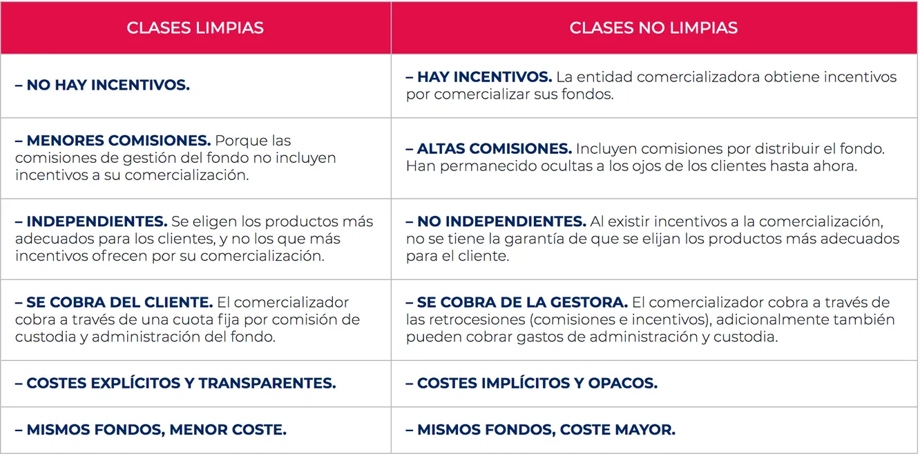 Las clases limpias se caracterizan por no soportar retrocesiones, es decir las comisiones que sobran los distribuidores, y solo llevan implícitas de forma transparente las comisiones que cobra la gestora. Por lo tanto, permiten pagar menos por lo mismo. Y la diferencia para el inversor es clara. Por poner un ejemplo, un fondo tradicional de renta variable aplica una comisión de gestión que gira alrededor del 1,5%-1,75%. De ese 1,5% en torno a un 0,5% se paga en concepto de retrocesión y un 0,25% como descuento a las plataformas. Pues bien, con las clases limpias, la comisión de gestión que se paga es bastante menor, alrededor de un 0,75%.