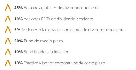 Esto lo complementa con un peso del 10% en Reits y un 5% en mineras de oro, ambas también con el requisito de dividendo creciente y misma filosofía para su selección.