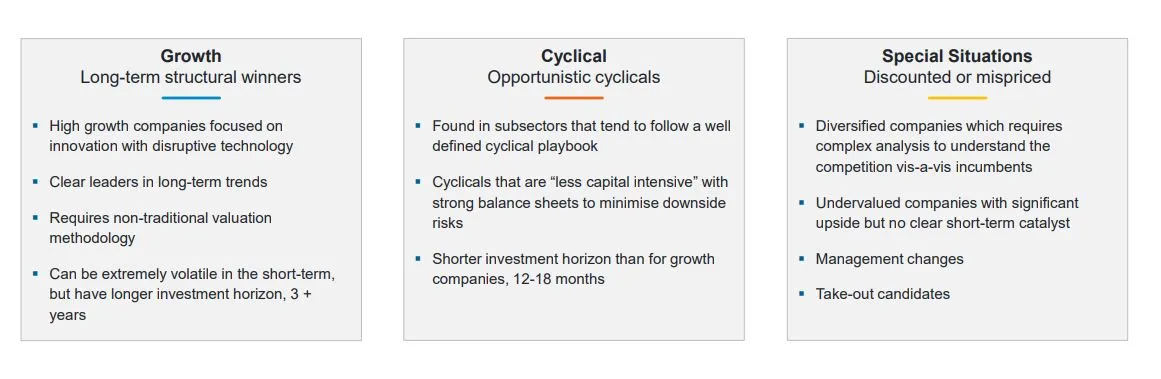 Para ello divide la cartera entre empresas de crecimiento, empresas cíclicas y en situaciones especiales. Las empresas de crecimiento son aquellas que se centran en la innovación o cuentan con tecnologías disruptivas que se encuentren en disposición de crecer con fuerza. Las oportunidades cíclicas se encuentran en subsectores y suelen tener posiciones sólidas en el mercado. En cambio, las situaciones especiales se refiere a acciones con potencial de recuperación cuyas valoraciones no reflejan.
