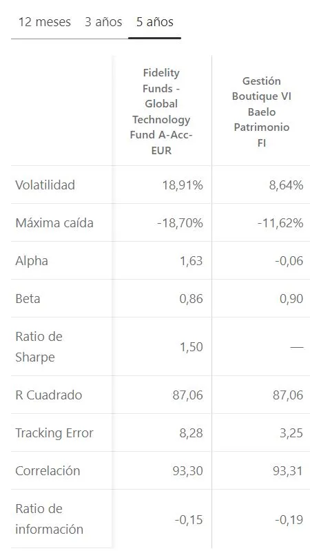 Tenemos un elevado dato de Sharpe a 5 años del Fidelity de 1,5 que no vemos en Baelo. En cambio a 3 años (por comparar ambos datos) vemos un Sharpe de 0,81 vs 0,34 que presenta Baelo Patrimonio, por lo que Fidelity Technology es mucho más eficiente en la relación rentabilidad y volatilidad. Esto se debe al gran excedente en rentabilidad que ha sido capaz de generar Fidelity sin disparar en exceso su volatilidad, posiblemente uno de los datos más importantes de la comparativa.