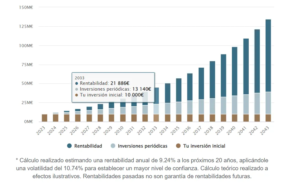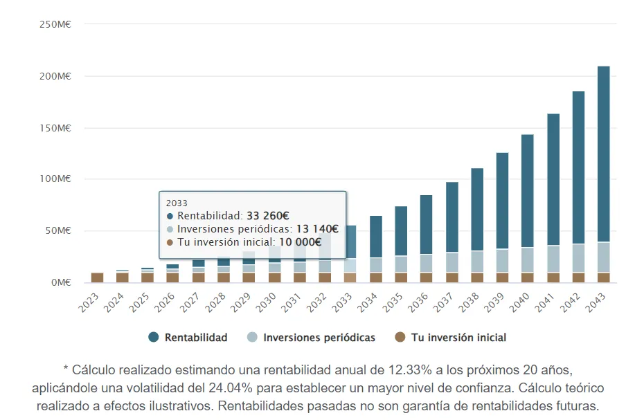 Supongamos un rendimiento anual promedio del 12,33%, que es más alto pero viene acompañado de mayor volatilidad. Después de 10 años, tu inversión inicial de 10.000 euros habría crecido a aproximadamente 33.260€.