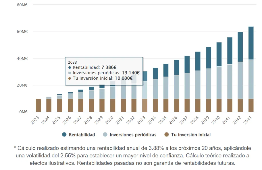 En el escenario conservador, optas por inversiones seguras y de bajo riesgo, como fondos de renta fija, bonos, cuentas de ahorro remuneradas, depósitos a plazo fijo... Estas inversiones tienden a tener tasas de interés más bajas, pero también son menos propensas a pérdidas significativas. Supongamos que obtienes un modesto 3.88% de interés anual en promedio.