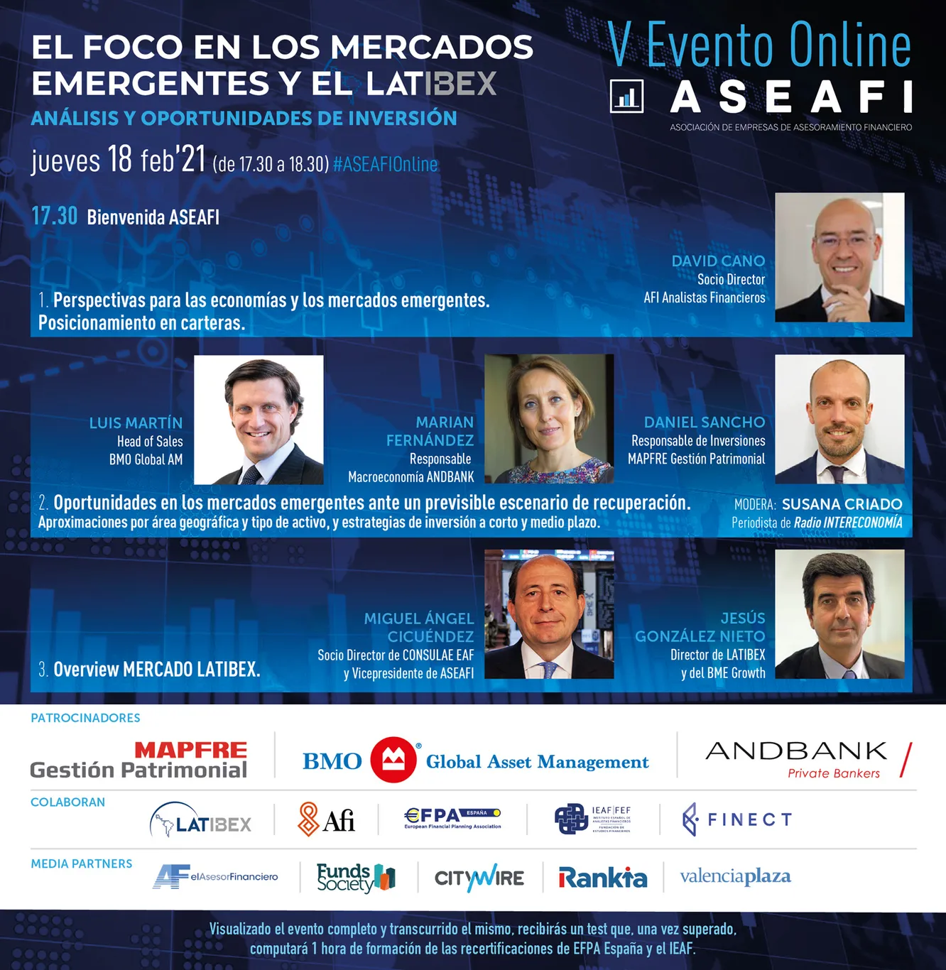 Este evento, promovido por ASEAFI, cuenta con el patrocinio de BMO Global Asset Management, Andbank y Mapfre Gestión Patrimonional y será desarrollado con la colaboración de Latibex, Efpa España, IEAF, Finect y con El Asesor Financiero, Citywire, Funds Society, Valencia Plaza y Rankia como media partners.