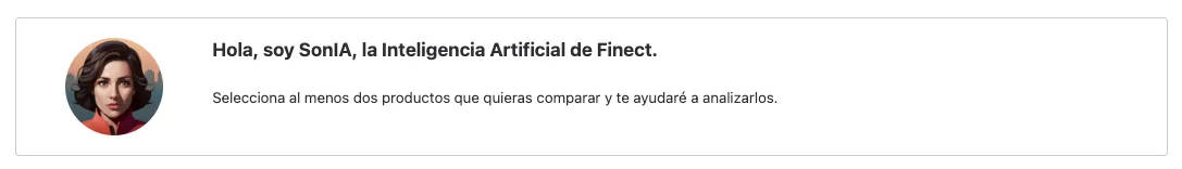 Una vez inicies la comparación, justo debajo del gráfico te saldrá la notificación para que puedas preguntarle a SonIA, nuestro perfil de inteligencia artificial: te ayudará a comparar los productos que hayas seleccionado.