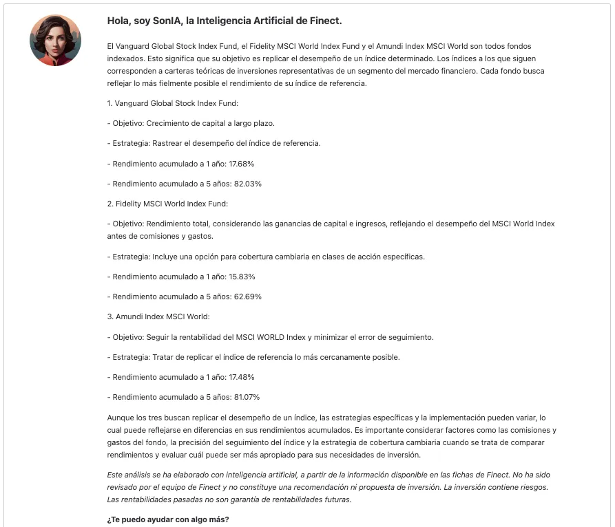 Seleccionando esta opción, SonIA te dará un informe detallado con las rentabilidades de cada fondo en diferentes plazos de inversión: 1 año, 3 años, 5 años y 10 años.