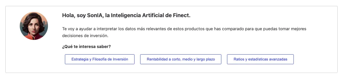 Antes del lanzamiento de la IA en el comparador, Finect ya había empezado a testar el uso de la IA en la generación de contenidos. A través del perfil de SonIA, un perfil de inteligencia artificial, los inversores ya consultan artículos y análisis, con interpretaciones de gráficos y tablas, creados a partir de IA generativa. De momento, con la supervisión final del contenido por parte del equipo de redacción de Finect.