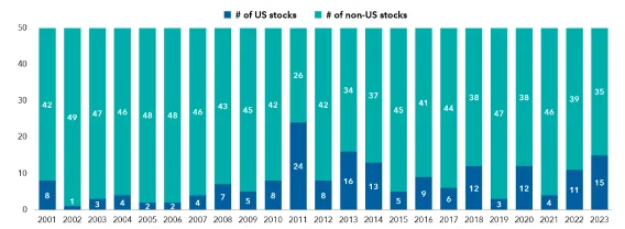 Lovelace explica que los inversores no deberían obsesionarse demasiado con la dirección de un único mercado, ya que podrían perder de vista otras muchas oportunidades. Esto es especialmente cierto si nos fijamos en los 50 principales valores del índice MSCI ACWI. En todos los años transcurridos desde el cambio de milenio, ni una sola vez el número de valores estadounidenses logró superar al de valores no estadounidenses.