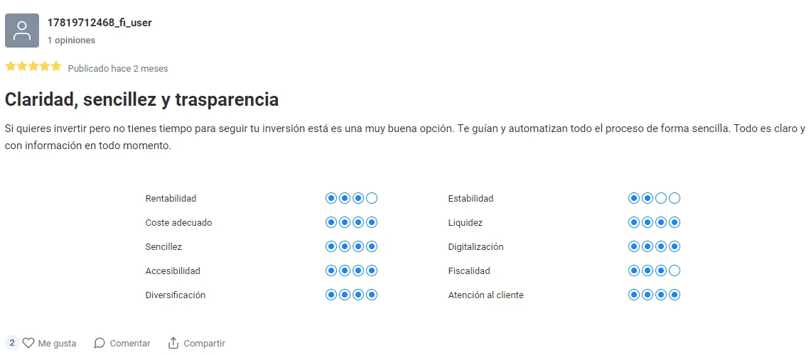 En nuestro afán por aportar al proceso de inversión la mayor de las transparencias, hemos dado una importancia capital a las opiniones de los usuarios. La valoración de los 'roboadvisors' corresponderá a los propios inversores de las herramientas, que podrán opinar sobre su rentabilidad, costes, sencillez, accesibilidad, fiscalidad, atención al cliente y así hasta diez diferentes e importantes variables que podrán ayudarte a decidir qué servicio de gestión indexada se adapta mejor a ti.