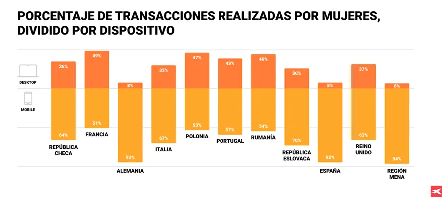 Otro de los aspectos destacados por el estudio de XTB es la tendencia global por el uso móvil en la realización de transacciones financieras por parte de las mujeres, destacando la importancia de las aplicaciones móviles y la accesibilidad para la inclusión financiera. Así, el uso móvil supera al uso de escritorio en términos de transacciones realizadas por mujeres. Aunque existen también diferencias por regiones. En países como Francia y Portugal, la diferencia entre el uso de escritorio y móvil es bastante equilibrada, mientras que en otros como Alemania, España y la región MENA el uso móvil es dominante.
