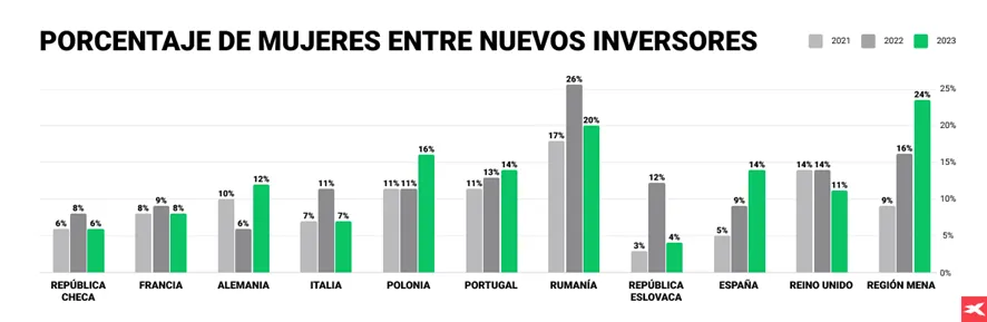 Así, por ejemplo, en el mismo periodo, Polonia ha pasado del 6,9% al 13,1% y Portugal del 6,9% al 12,3%. Por su parte, Rumanía y la región MENA destacan por tener los incrementos más significativos, con Rumanía alcanzando un 19,8% y MENA un 18,2% en 2023, lo que podría reflejar políticas específicas de inclusión financiera o cambios culturales en la percepción de la inversión entre las mujeres.