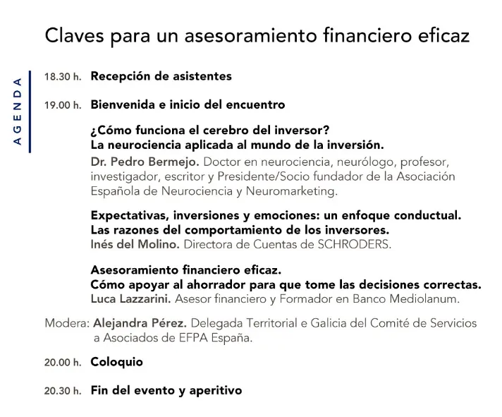 Este próximo miércoles 25 de septiembre, si estás en Vigo, te invitamos a asistir al evento que celebraremos con el título Claves para un asesoramiento financiero eficaz. Tendrá lugar a partir de las 18.30 en el Círculo de Empresarios de Galicia, en Rúa de García Barbón, 62. Se trata de un encuentro imprescindible para los asesores financieros, con el que aportaremos luz sobre cómo tomamos nuestras decisiones de ahorro e inversión.