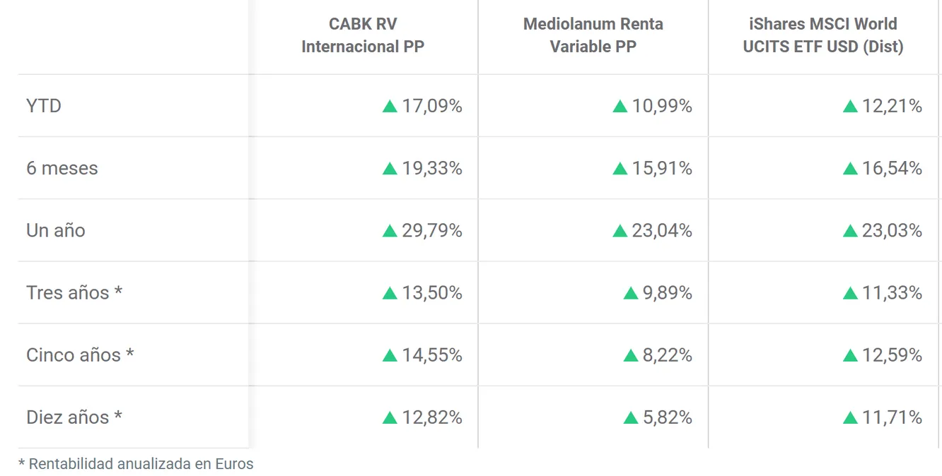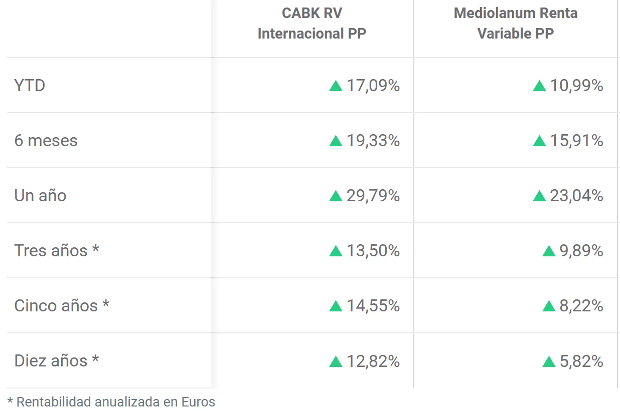 La diferencia entre ambos fondos es enorme, siendo el CABK RV Internacional el que ha obtenido mejores resultados, con rendimientos superiores al 10% a 5 y 10 años. Es evidente que el mayor peso en Estados Unidos ha sido el origen de esta rentabilidad, mientras que el Mediolanum Renta Variable PP, al tener un menor peso en Estados Unidos y mayor peso en Europa, se ha visto más afectado.