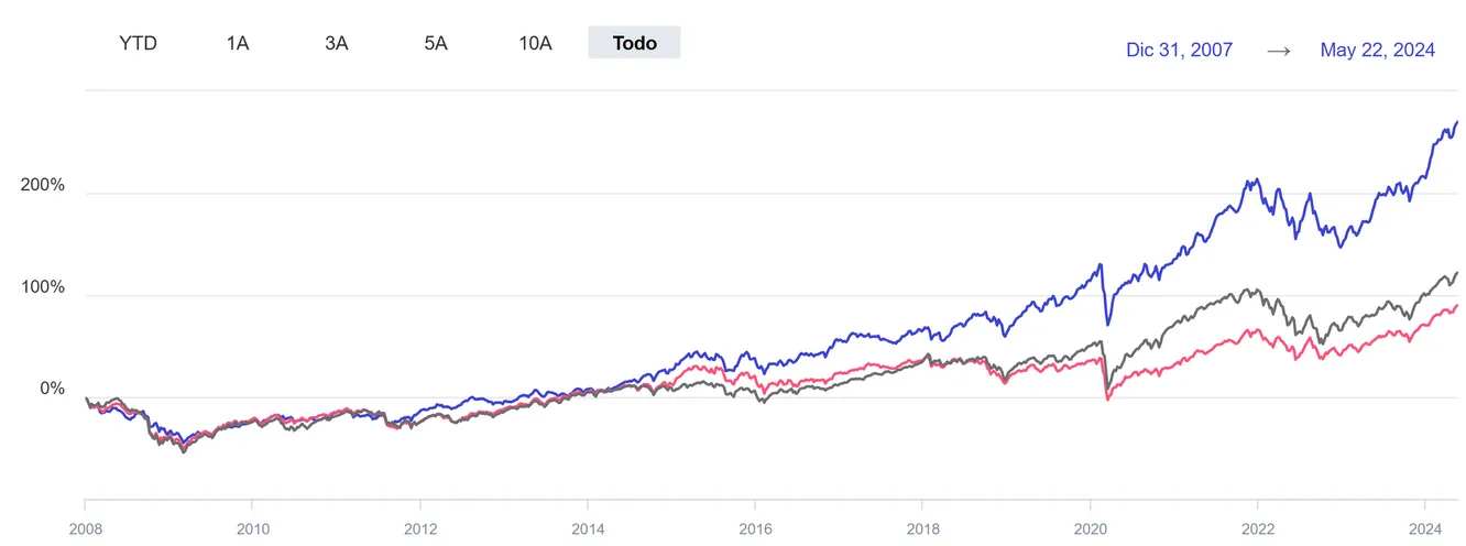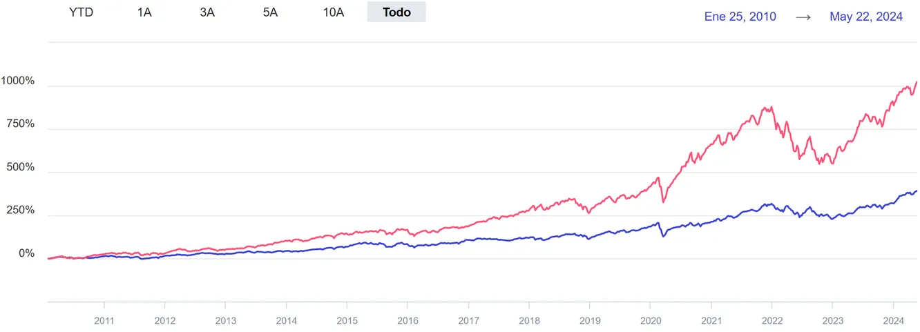 Esto cambia completamente la perspectiva. Mientras que el CABK ha obtenido un rendimiento del 391%, el ETF que replica al NASDAQ ha logrado la impresionante cifra del 1.000%. Por cierto, quiero aclarar que la línea roja puede parecer más arriesgada (por el movimiento más brusco en el gráfico) por la escala, pero realmente no es así.