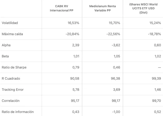 Al ver las métricas para evaluar el desempeño frente al mercado, como el alpha y el ratio de información, observamos que uno ha generado valor frente al mercado (CABK), mientras que el otro lo ha destruido, con un alpha negativo de -3.60 a 5 años (Mediolanum). Esto es normal en el Mediolanum dadas las pésimas rentabilidades relativas en todos los periodo contra el mercado.